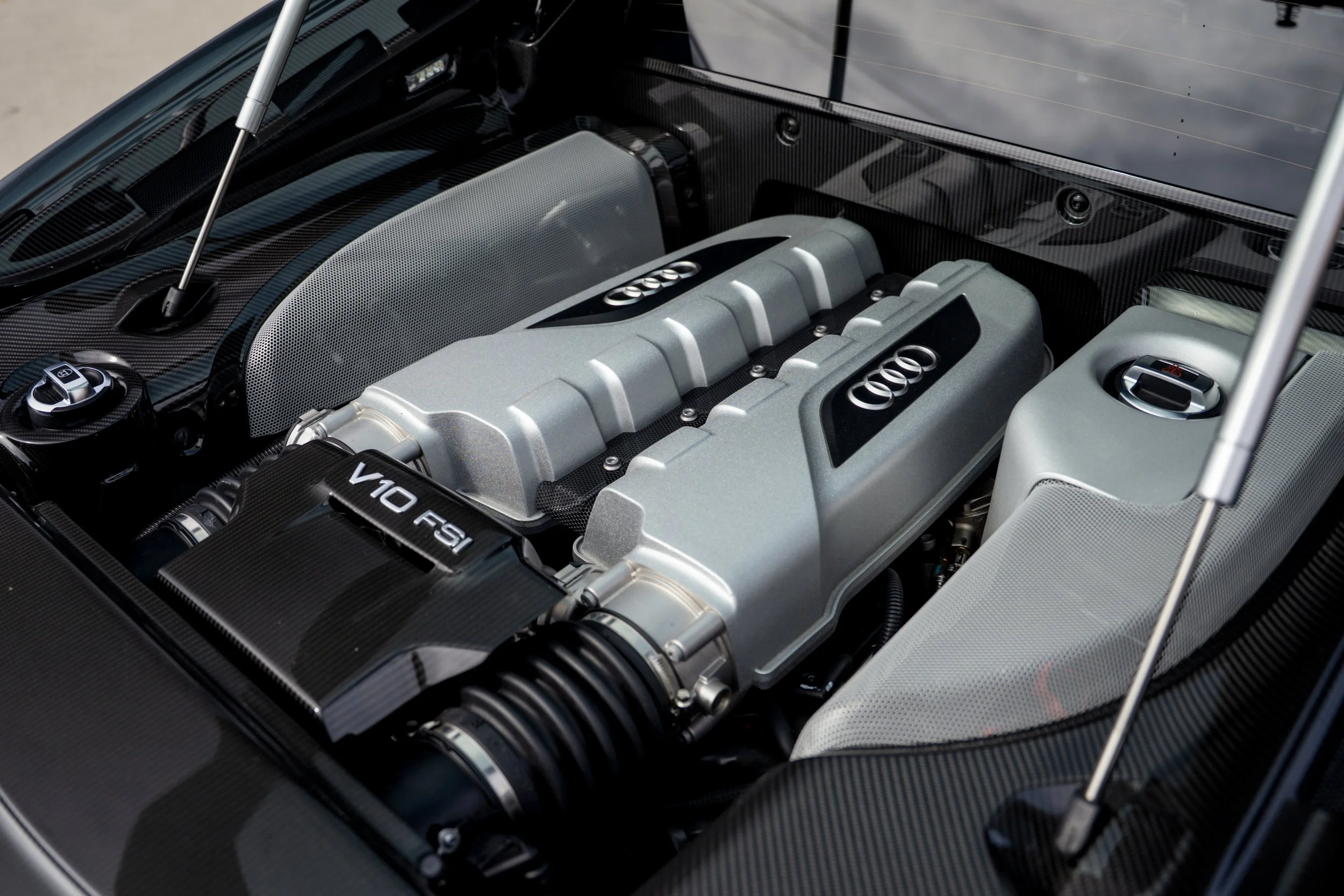 Originally unveiled at the 2006 Paris Motor Show, the R8 was initially fitted with a 4.2 liter V8 which spun over 8,000rpms and made 420 horsepower. It was essentially the same engine in the B7 RS4, except this unit was upgraded with a dry-sump oiling system. The Audi R8 also featured magnetic ride suspension, which was all-new at the time and gave drivers an extra level of control over the driving experience.
